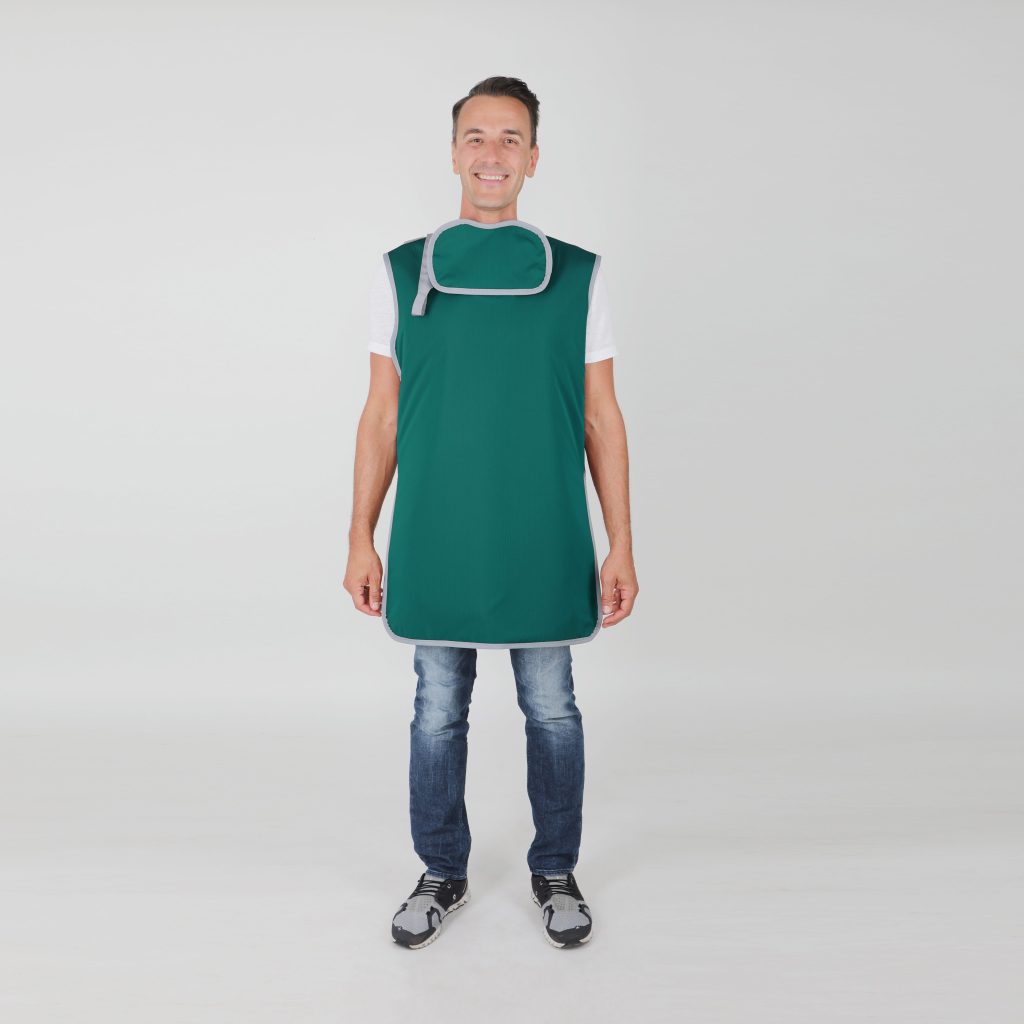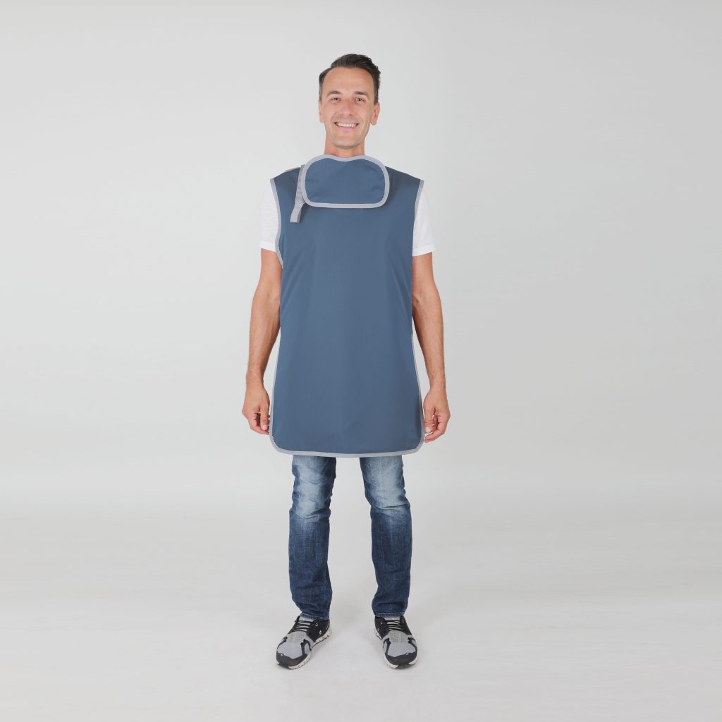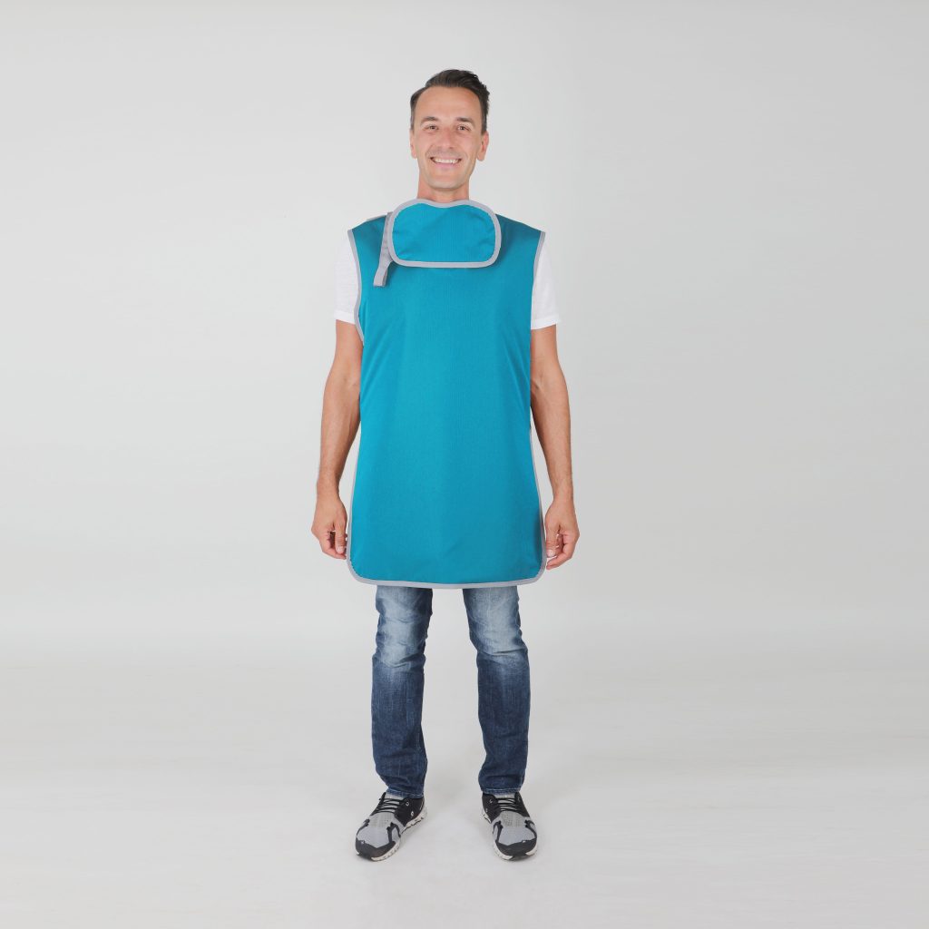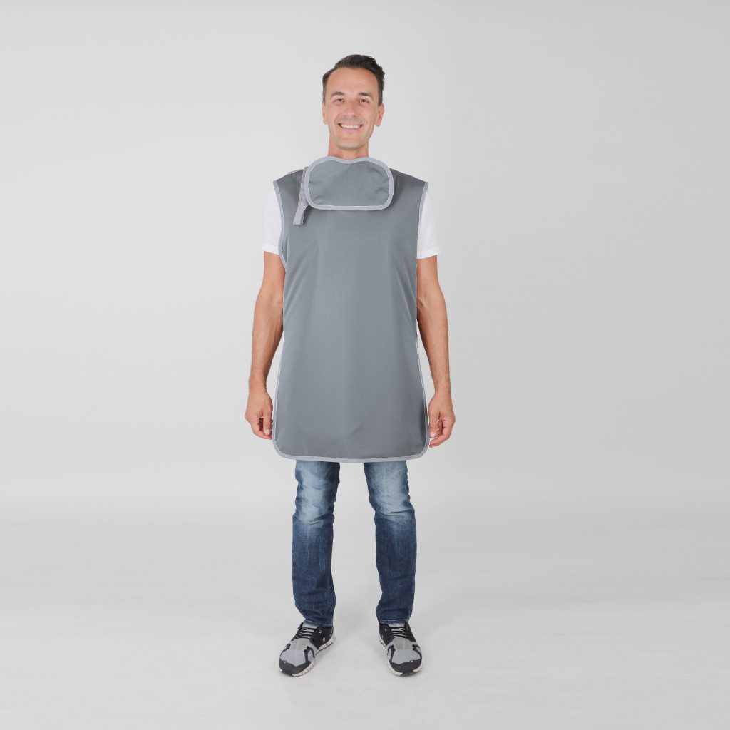 Det praktiske hektefestet på skulderen gjør det enkelt å ta på forkleet fra siden. Omkretsen kan enkelt justeres ved hjelp av krok- og burrelåsene i ryggen. Den integrerte skjoldbruskkjertelbeskyttelsen kan justeres i høyden, slik at den ikke forstyrrer bildet.