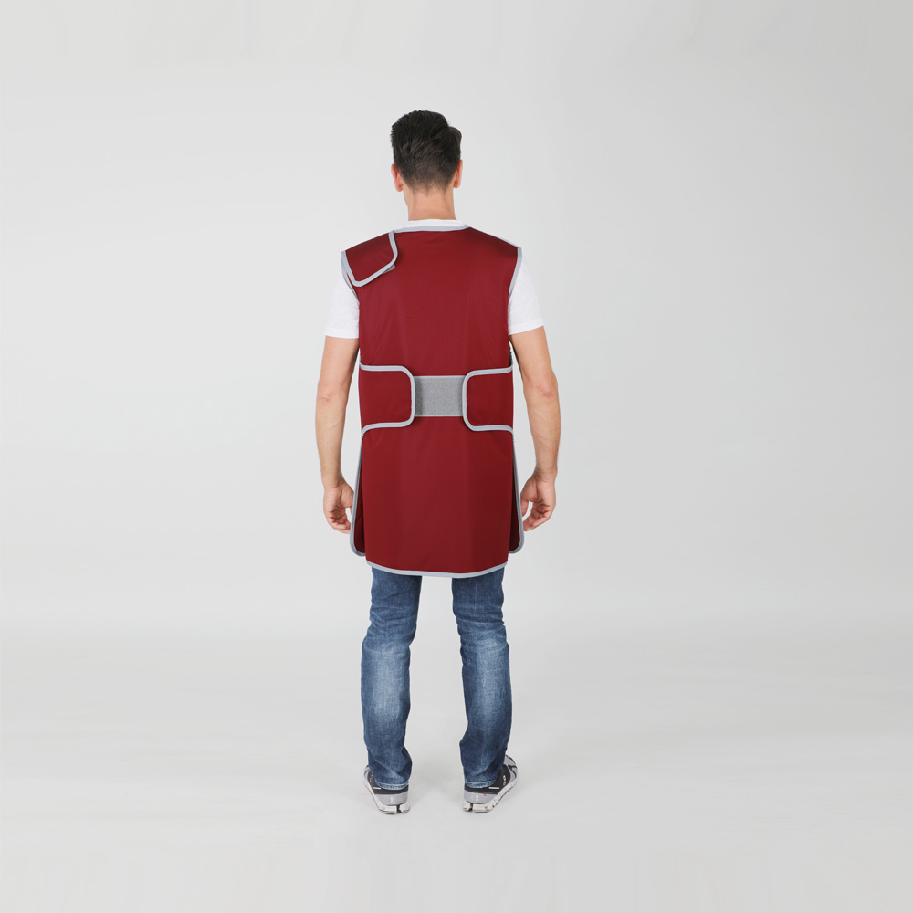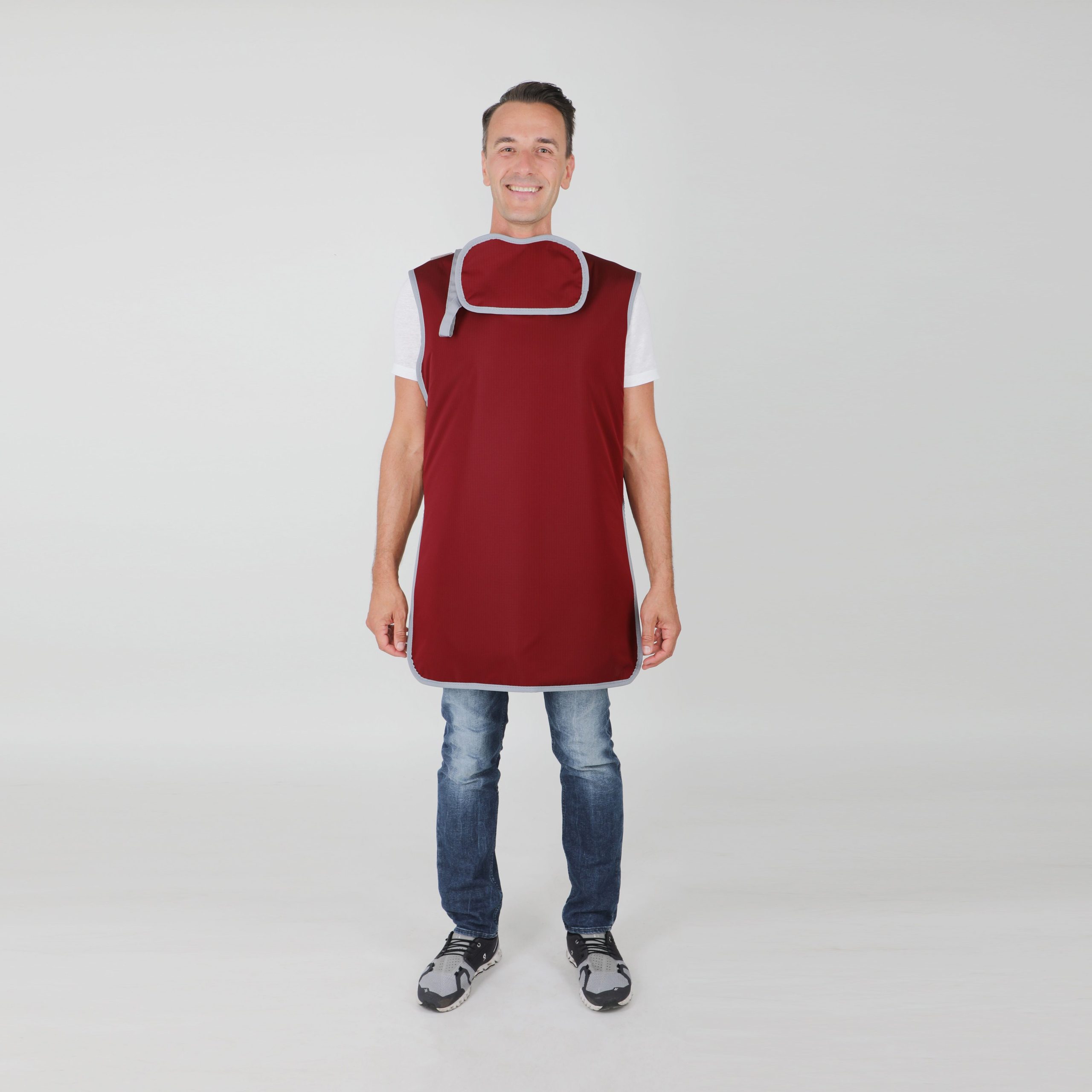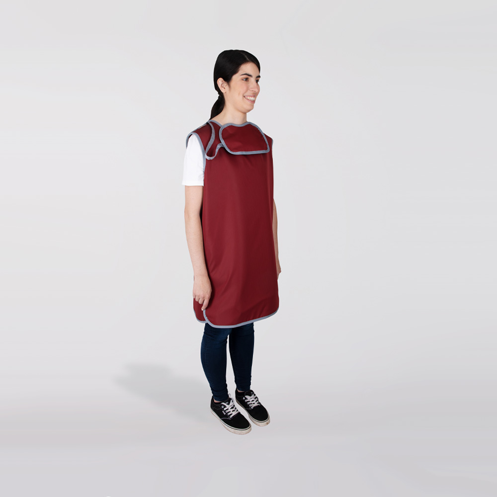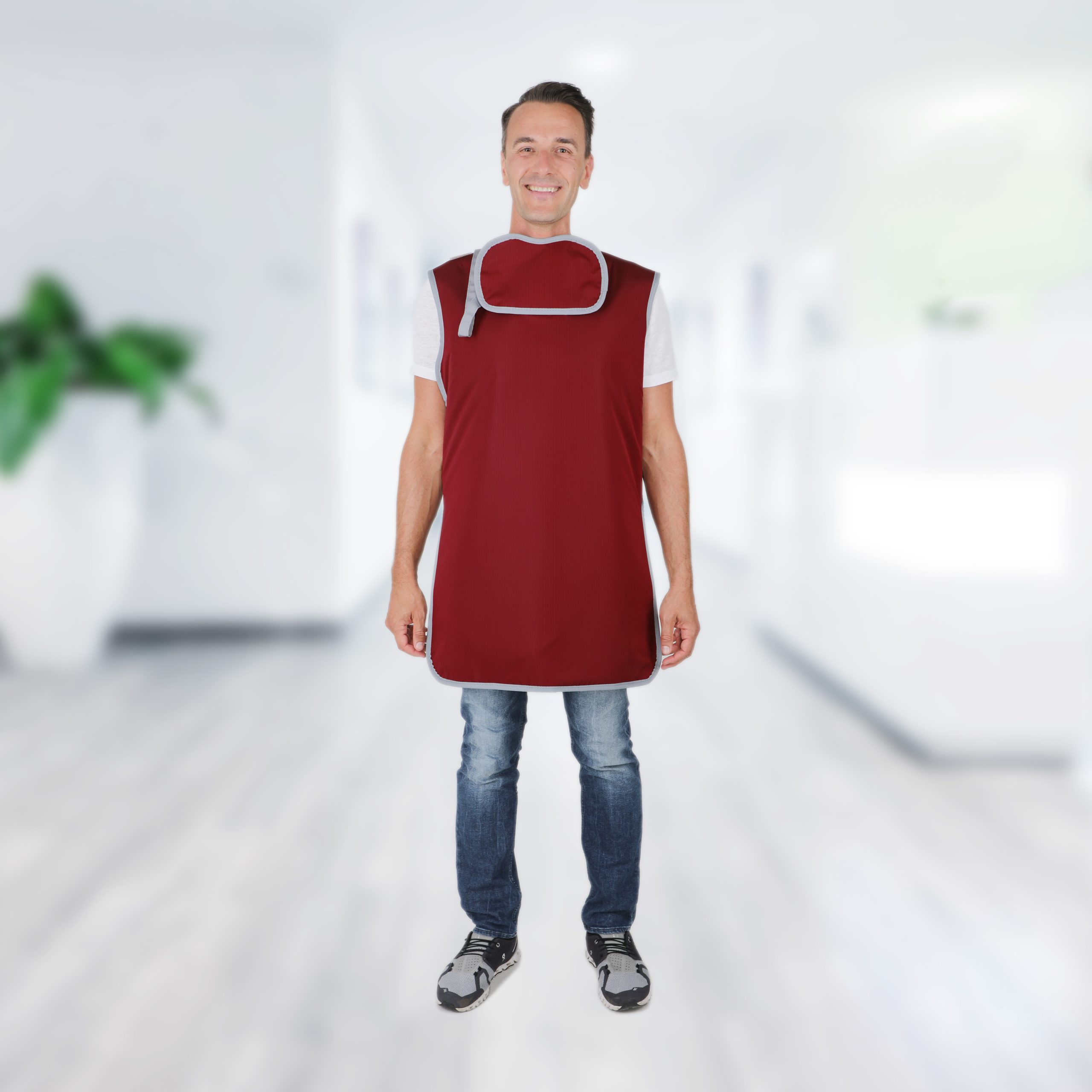 Det praktiske hektefestet på skulderen gjør det enkelt å ta på forkleet fra siden. Omkretsen kan enkelt justeres ved hjelp av krok- og burrelåsene i ryggen. Den integrerte skjoldbruskkjertelbeskyttelsen kan justeres i høyden, slik at den ikke forstyrrer bildet.